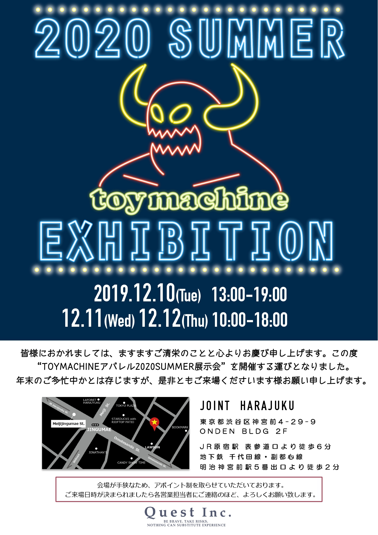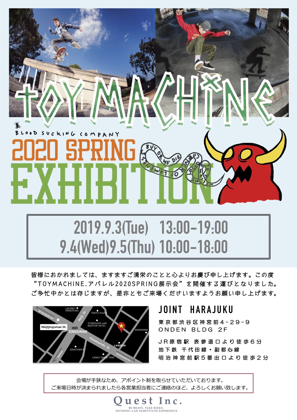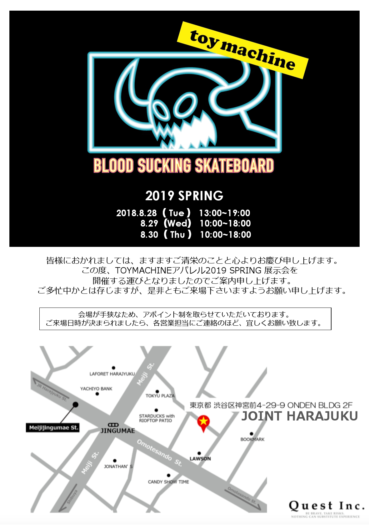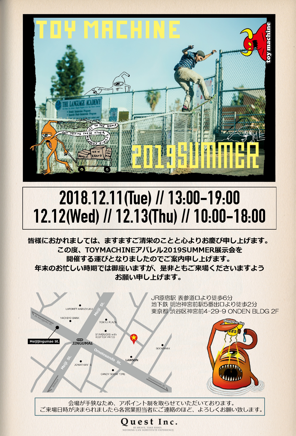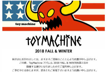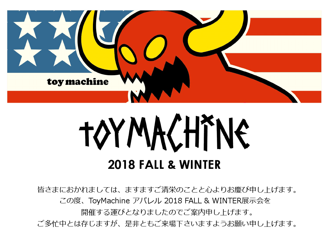 この度、株式会社Questより【TOY MACHINE 2018 FALL&WINTER展⽰会】を開催する運びとなりましたのでご案内致します。