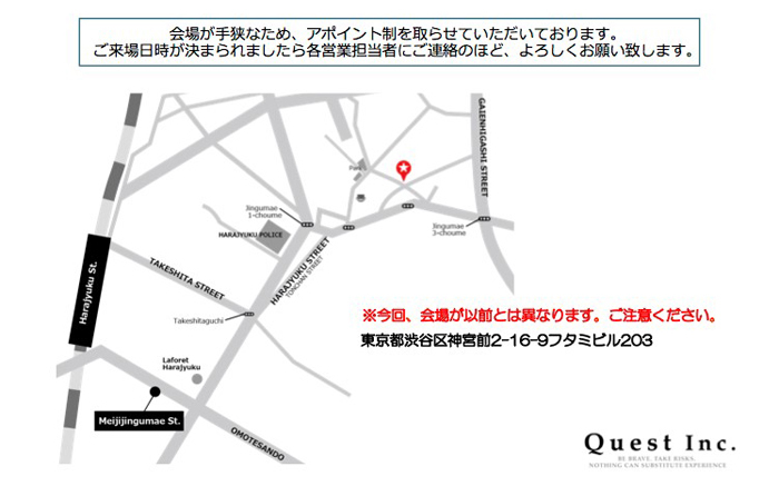 ご来場日程が決まりましたらアポイント頂けますようにお願い致します。